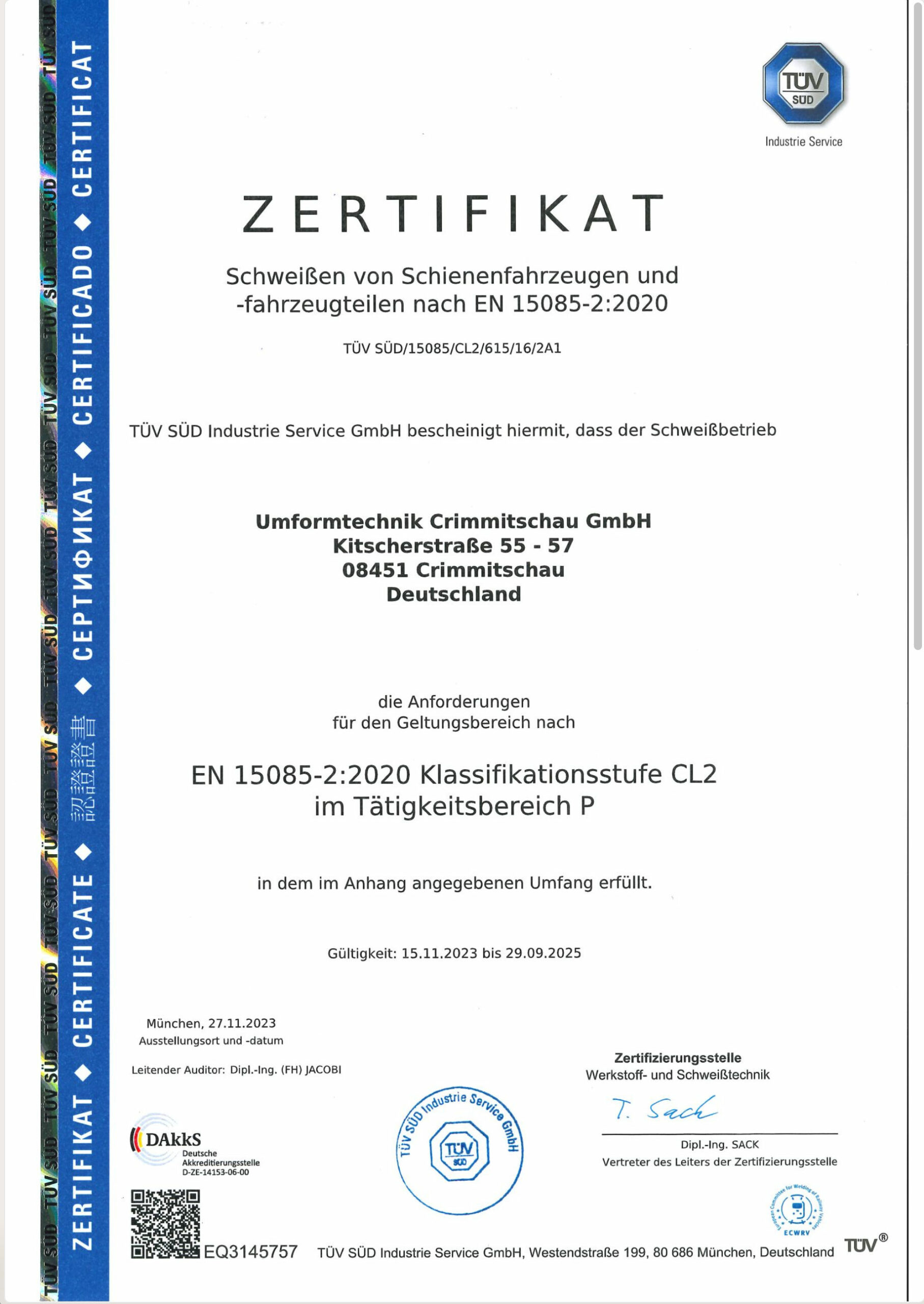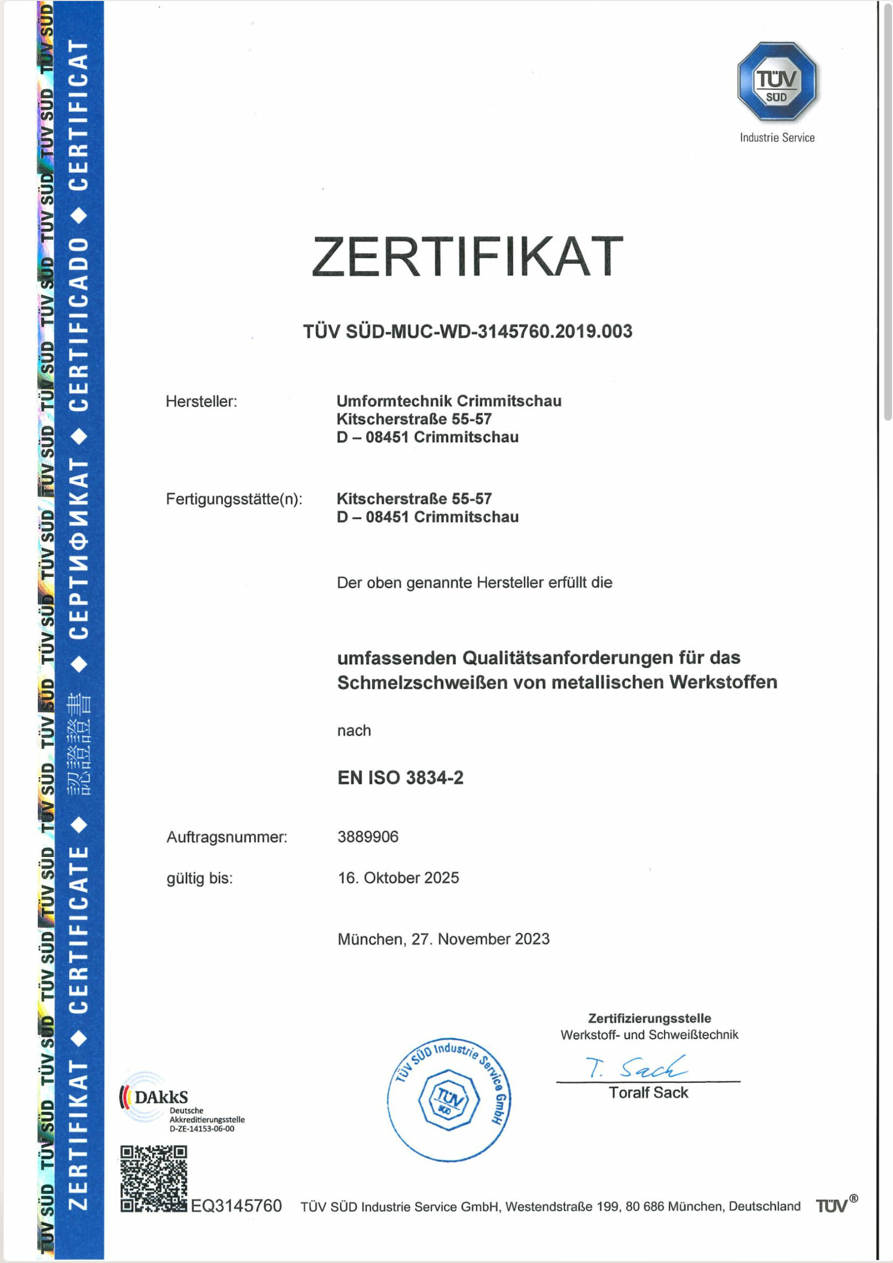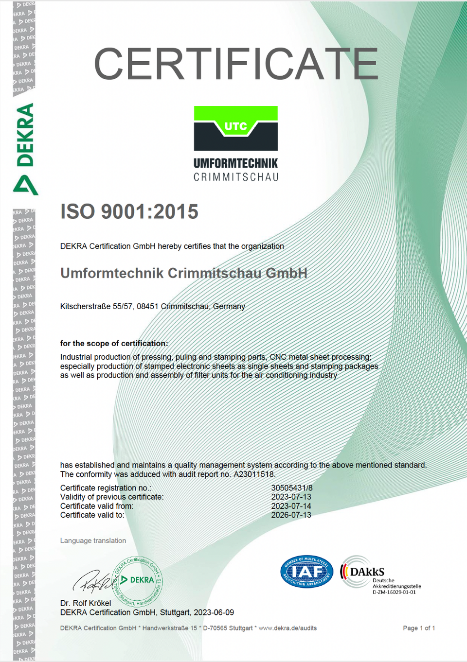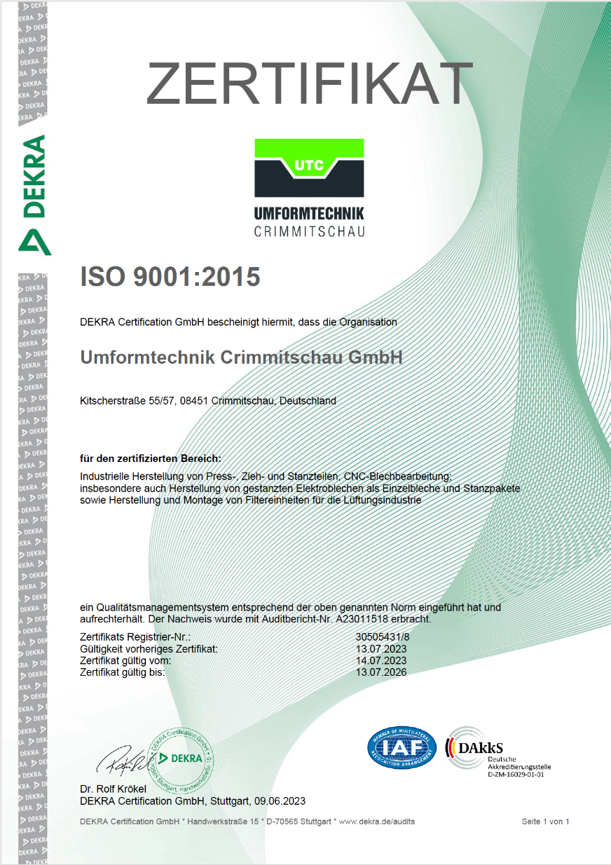 Selbstverständlich sind unsere Fertigungsabläufe und Prozesse im Interesse unserer Kunden genormt. Die Umformtechnik Crimmitschau GmbH ist nach ISO 9001:2015 zertifiziert.